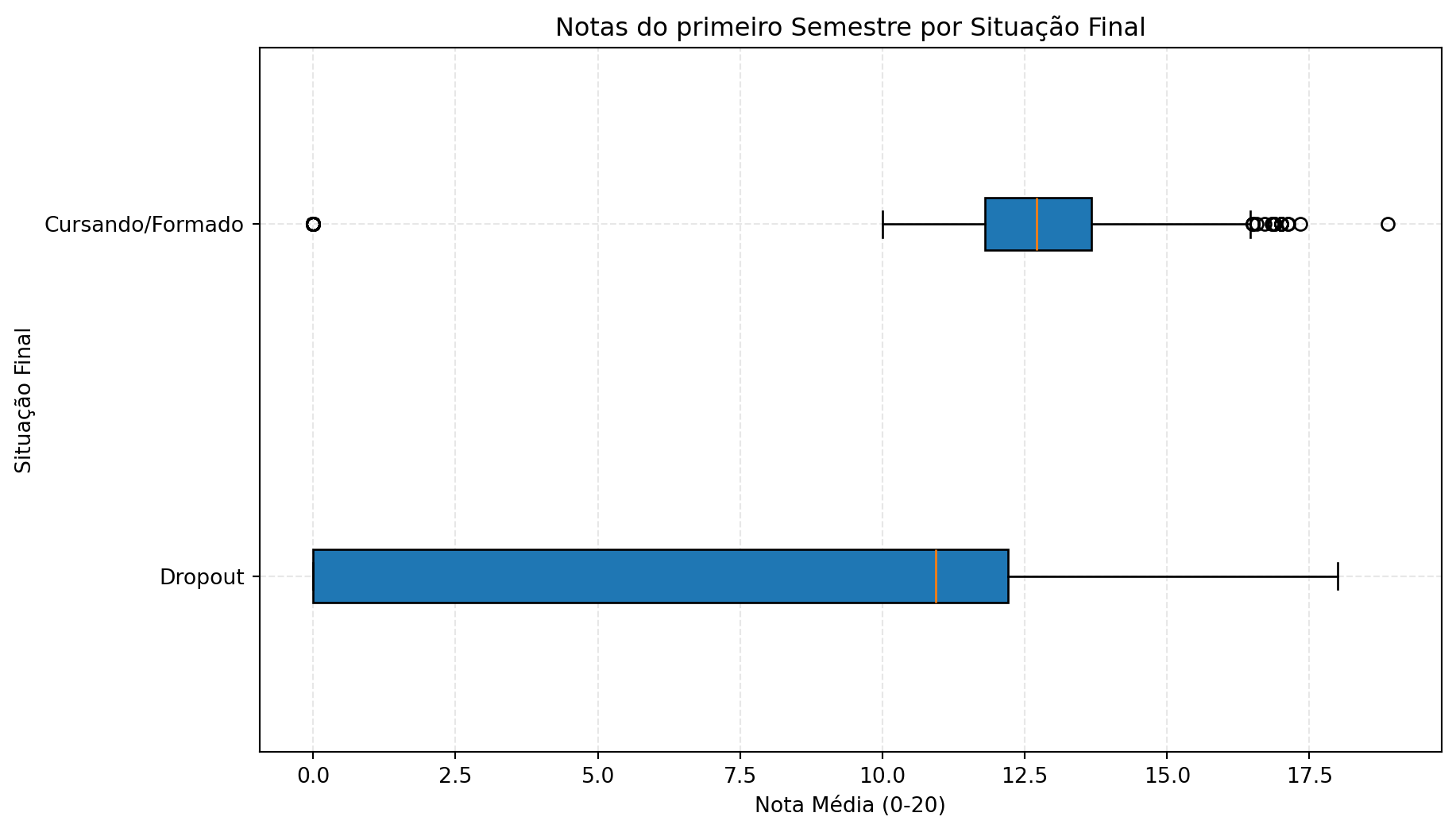 Além disso, a comparação das notas do primeiro semestre mostrou que os alunos que evadiram (Dropouts) tendem a apresentar uma concentração de notas na faixa inferior logo nos primeiros meses. Isso prova que o insucesso inicial funciona como um “sintoma” precoce, permitindo que a universidade identifique o aluno em risco antes mesmo dele abandonar o curso de fato.